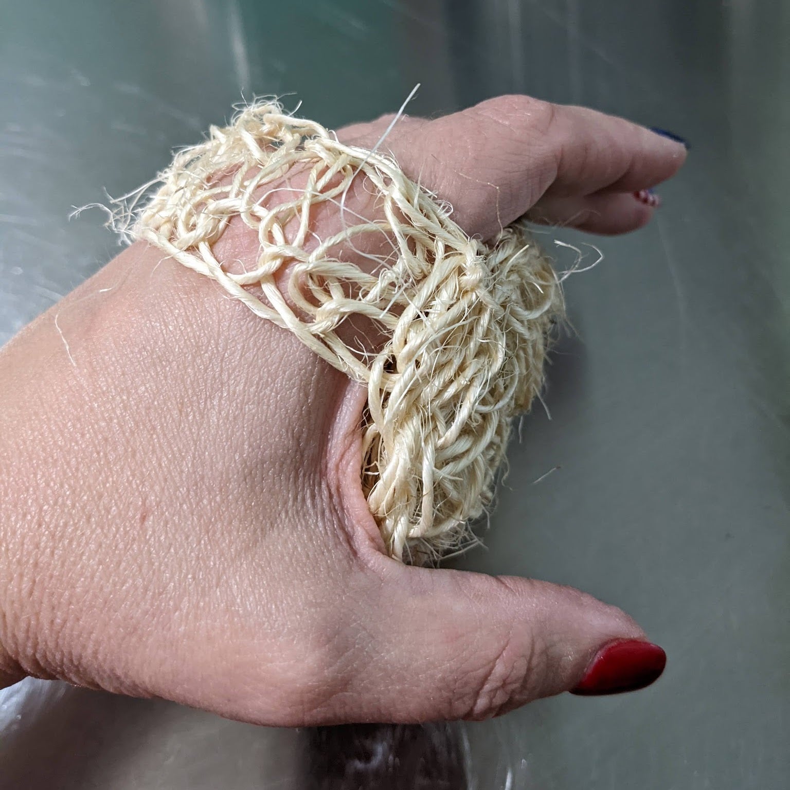 The plant-based Sisal Body Scrub Pouf is super exfoliating and easy to hold - simply slide the crochet hand strap over your fingers!